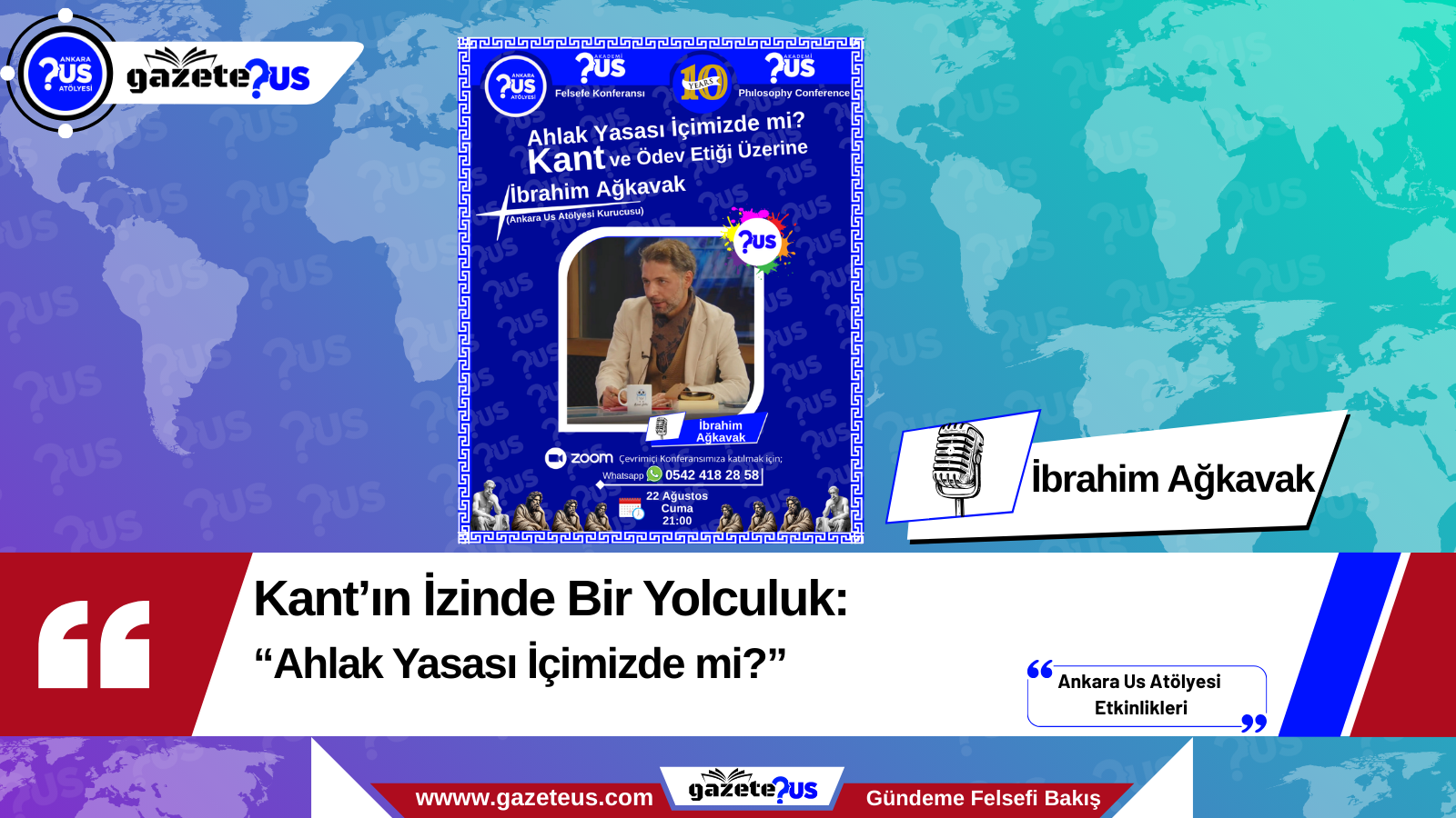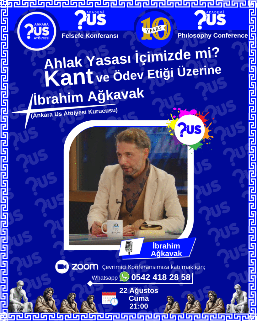 Ankara Us Atölyesi, düşüncenin izini süren çevrimiçi konferanslarına bir yenisini ekliyor. 22 Ağustos 2025 Cuma günü saat 21.00’de gerçekleşecek etkinlikte, atölyenin kurucusu İbrahim Ağkavak, felsefe tarihinin en etkili isimlerinden Immanuel Kant’ı merkezine alarak, ahlak ve ödev üzerine derinlikli bir tartışma yürütecek.