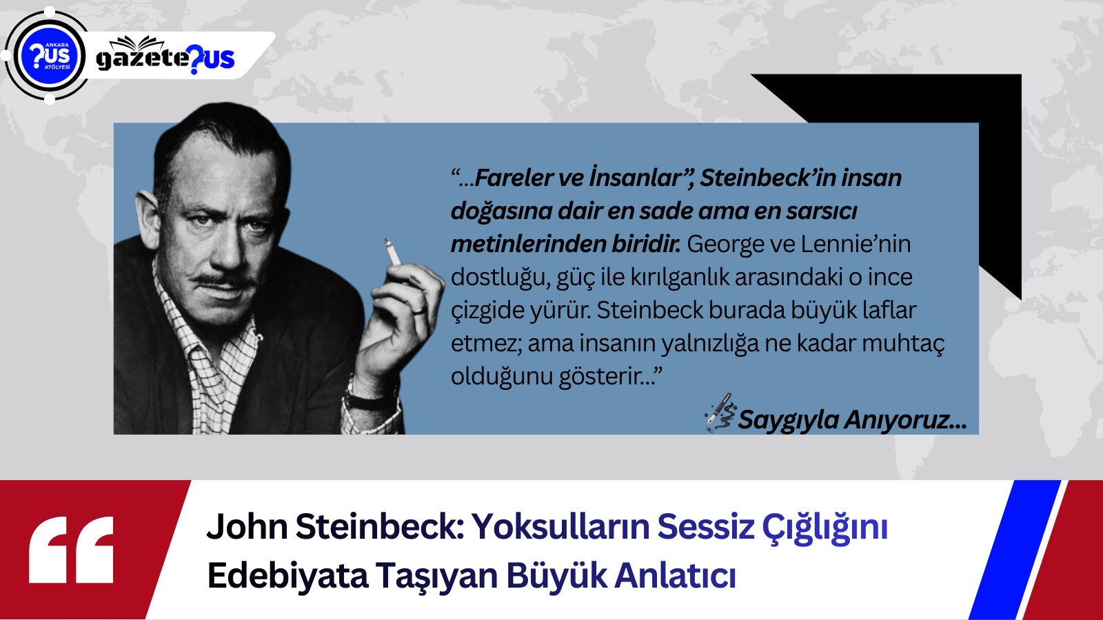 20 Aralık’ta John Steinbeck’i anarken, onu bir heykel gibi seyretmek değil; onunla yüzleşmek gerekir. Yoksulluğa, adaletsizliğe, yalnızlığa karşı nerede durduğumuzu sormak gerekir. Çünkü Steinbeck’in edebiyatı, okuru edilgen bırakmaz. Okuru sorumlu kılar.