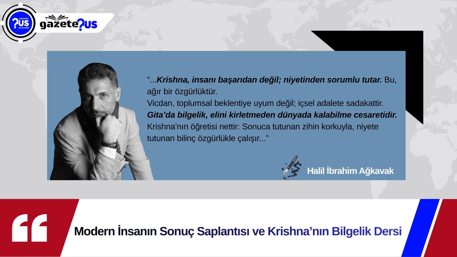 “Krishna, insanı başarıdan değil; niyetinden sorumlu tutar. Bu, ağır bir özgürlüktür. Vicdan, toplumsal beklentiye uyum değil; içsel adalete sadakattir. Gita’da bilgelik, elini kirletmeden dünyada kalabilme cesaretidir. Krishna’nın öğretisi nettir: Sonuca tutunan zihin korkuyla, niyete tutunan bilinç özgürlükle çalışır.“